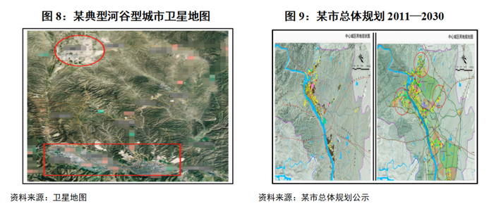 例如,图8为典型河谷型城市,由于河谷发展受限,近年来大力拓展谷地北侧新区,但囿于地理距离过于遥远,新区发展速度较慢,大片土地仍然缺乏投资,该区域城投账面沉淀大量开发成本,所发行债券收益率高企。图9所示为某河谷型城市,长期沿河东侧发展,城市空间布局狭长,地方政府计划在2011~2030年跨河发展,利用河对岸空间,加大城市空间拓展范围。由于河流割裂城市地理空间,通常来讲,城市跨河发展难度较大,但所幸该市跨河建设区与最繁荣的核心市区距离不远,经济易形成联动,存在较好发展机会。长期来看,若跨河交通通畅,土地价值仍存在一定提升的空间。目前该区域跨河建设收效较好,城投受益于当地较强的土地出让能力,回款保障程度较高,所发行债券收益率较低。