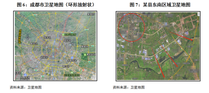 如图7,某县域城市2012~2030年总体规划计划利用东南方向国道改线将城市空间向东南方向大幅拓展。目前东南区域从卫星地图上看,尽管路网逐渐形成,但“空地”仍较多。同时,该县七普较六普常住人口出现大幅下降。持续流失的人口和当地开展的大力度郊区化建设,不得不使人对未来区域土地价格稳定性和建设资金平衡能力产生担忧。区域城投账面沉淀大量建设成本,发债难度大,已发债券收益率高企。一般情况下,小城市过早开展环形放射状规划,存在过度郊区化的风险,近郊土地廉价化、核心城区功能分散化将难以避免,城市持续发展能力存在较高不确定性。