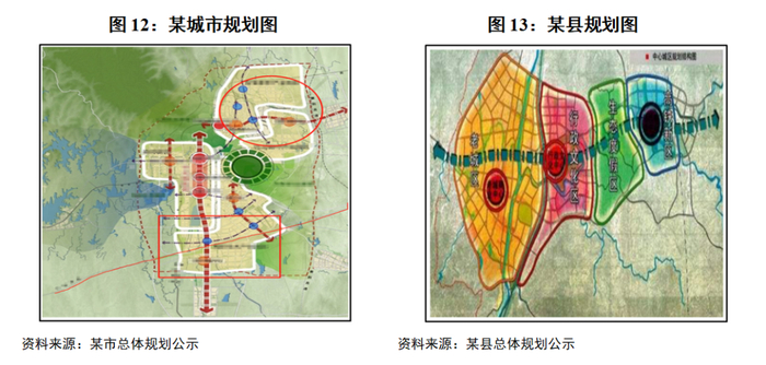 在此,我们尝试从城市规划角度进一步丰富城投分析的维度,加入更多未来预期要素。城市规划通常对城市所处区域的整体进行长周期设计,系统性规划了未来城市规模、发展建设目标、国土资源利用方式等等。此类设计规划了城市发展重点,也制定了城市未来投资建设目标,甚至很大程度决定了城市建设发展可持续性。通过分析评价地方政府城市规划历史与发展目标,可以逐渐把握城市建设资金平衡能力,并结合城投主体业务范围,判断城市建设资金对城投业务的保障力度。在当前城投行业融资环境趋于分化的市场背景下,增加对于城市规划的分析角度,或许能够为城投行业信用策略的前瞻性及有效性提供更多支持。