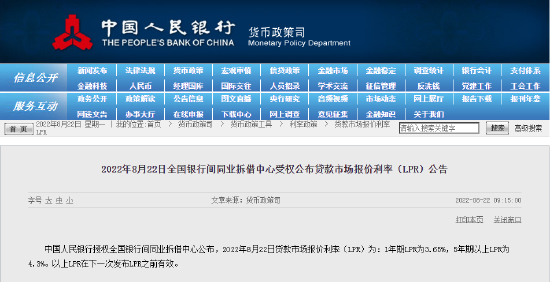 中国人民银行授权全国银行间同业拆借中心公布,2022年8月22日贷款市场报价利率(LPR)为:1年期LPR为3.65%,5年期以上LPR为4.3%。以上LPR在下一次发布LPR之前有效。