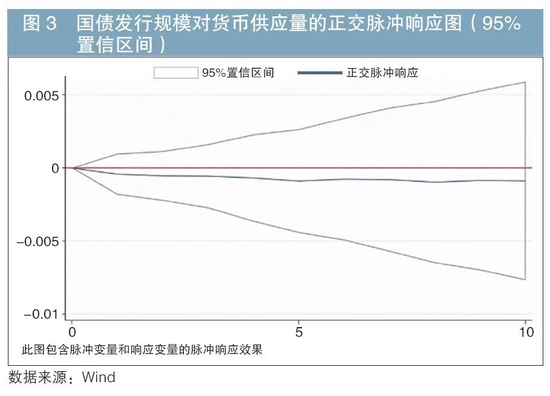 可以看出,国债发行期限结构在出现一个单位冲击时,货币供应量在前两期出现了短暂上升,但随即出现下降,并在第五期到第十期之间出现波动,随后趋于0;而国债发行规模对货币供应量的影响第一期即表现为负,且没有显著波动。上述结果说明,国债发行平均期限结构与发行规模对货币供应量的冲击统计上不显著,货币供应量缺乏对国债发行期限的敏感性。