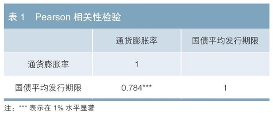 本文进一步尝试分析我国国债期限结构的影响因素。国债期限结构通常和一国经济发展状况以及国债的财政、金融属性密切相关。由此,本文用皮尔森(Pearson)相关性检验考察国债期限结构与国家经济状况之间的相关性,用通货膨胀率代表国家的经济状况,以居民消费价格指数(CPI)衡量。国债期限结构用当年发行国债的加权平均期限衡量,其权重为每只国债的发行规模。样本期间为2011年至2021年,所得结果如表1所示。