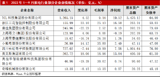 2022年以来,政府逐步细化家电行业发展标准,引领家电消费和生产制造双升级,人民群众对低碳、绿色、智能、个性化家电的需求提升,家电企业前三季度业绩表现分化程度也随之加深,提质扩容成为家电企业的经营分化的焦点,一些品牌较好,产品竞争力较强,市场容量较大的企业无论从收入总量或是从利润空间都表现较好,家电行业需求拉动仍主要依赖于改善升级,业内企业发展主要依赖于提升品质、扩大业绩。经营家用按摩椅品类的企业利润摊薄,也有部分企业呈现出微利的状态;整体看,业绩增长率较去年同期有所下降。从资产规模及资产负债率来看,规模较小的民营企业资产负债率仍维持在较低的水平,规模较大的国有企业资产负债率相对较高,整体看,杠杆率与去年同期相比略有上扬。