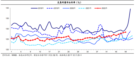 (7)交易所债市杠杆率继续回升、续创年内新高。至12月23日当周交易所债市杠杆率为128.4%,环比上行0.2个百分点、同比继续上行3个百分点。