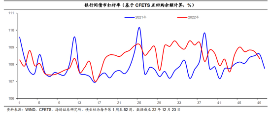 (6)银行间杠杆率季节性回落、为近7周以来新低。临近年末,资金面临跨年,至12月23日当周银行间债市杠杆率为108.3%、低于年内均值水平,环比继续下行0.4个百分点、同比转为下降0.3个百分点。