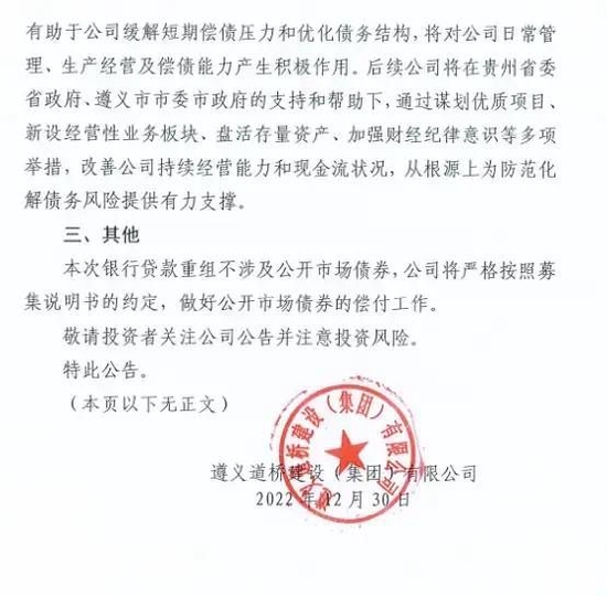 2022年12月30日,遵义最大的城投遵义道桥公告称,其155.94亿银行贷款重组方案已经出炉,展期20年且前10年不付利息。