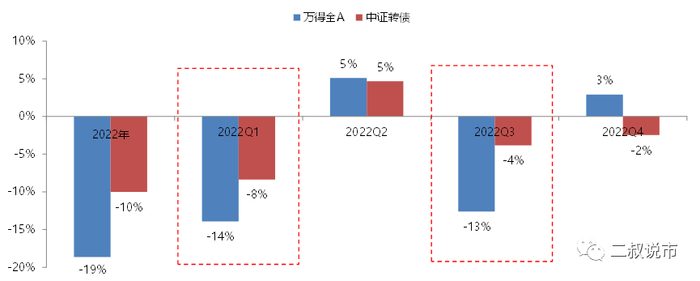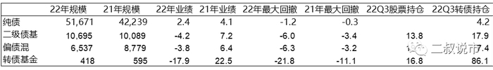 公募转债多以相对收益为考核目标,仓位上经常接近上限,很少会做大幅度的摆动,且转债基金大部分都有不低的权益仓位,2022年Q1-Q3公募转债基金的权益仓位平均在15-20个点,而权益本身在熊市的波动会相较转债更大,给转债债基带来了一定的拖累。