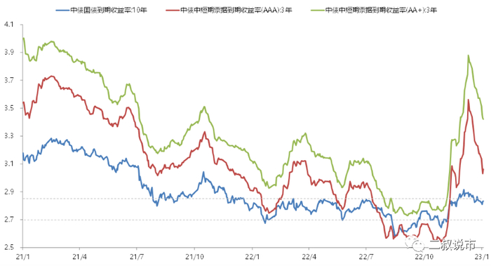 随着防疫政策优化和地产支持力度提升,经济复苏预期强化,10年期国债收益率快速拉升触及2.9%以上的全年高点,利率上行带来了理财赎回的负反馈冲击,信用利差也迅速扩大。