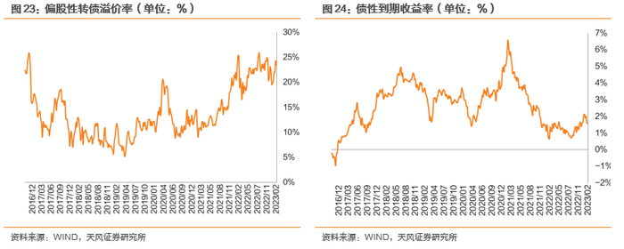 偏股和偏债型转债均有低溢价率的可能:对股性较强的转债来说,如果股价已经处于较高的水平,转债赎回概率较大,转股溢价率会被压缩到一个较低的水平;对债性较强的转债来说,如果转债股价长期低迷,赎回或转股概率不大,转债价格将围绕债底波动,此时溢价率水平和转债价格均较低,俗称“双低”转债。