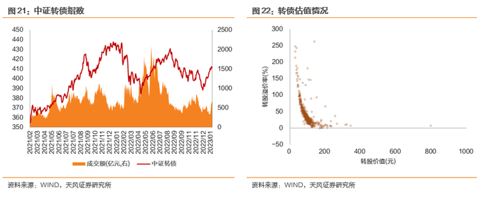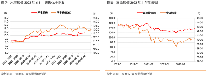 处于上述两种状态下的转债在特定的投资环境下可能有较好的表现:(1)低溢价率的偏股型转债在正股表现强势时往往表现优于正股,这是因为这类转债在正股产生回撤时跌幅相比正股更低(可以从期权delta的角度来理解),相当于在股价上涨时“上了一层保险”,对投资者更具有吸引力,例如2022年6-8月的禾丰转债,由于有充分的赎回预期,转债溢价率被压缩到几乎为0的水平,因此表现好于同时期正股;(2)低溢价率的偏债型转债背靠债底,价格下降空间有限,在市场表现低迷的情况下具有较强的防御能力。例如2022年上半年的嘉泽转债,在转债市场回调时表现出了明显抗跌能力。