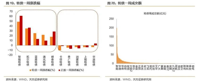 本周无转债上市。两市合计333只转债上涨,占比71%,涨跌幅居前五的为智能转债(48.96%)、拓尔转债(34.96%)、蓝盾转债(25.24%)、通光转债(21.85%)、嵘泰转债(17.91%),涨跌幅居后五的为卡倍转债(-10.14%)、贵广转债(-4.71%)、润建转债(-3.68%)、上能转债(-3.53%)、华源转债(-3.52%);从相对估值的角度来看,109只转债转股溢价率抬升,占比23%,估值变动居前五的为通光转债(24.26%)、大参转债(11.58%)、家悦转债(11.24%)、海优转债(10.64%)、盛路转债(9.27%),估值变动居后五的为蓝盾转债(-146.16%)、科达转债(-36.06%)、翔鹭转债(-28.53%)、万兴转债(-25.67%)、中陆转债(-22.26%)。