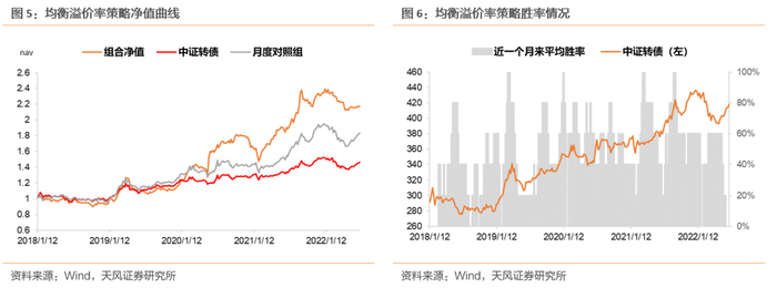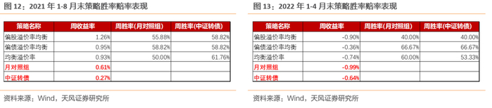 我们称前文策略1为“偏股溢价率均衡策略”,策略2为“偏债溢价率均衡策略”。从策略构成特点来看,偏股溢价率均衡策略更适合股市表现较好的市场环境中使用,偏债溢价率均衡策略更适合股市表现不佳时作为防御型策略。例如在2022年1-4月末的A股熊市中,偏债溢价率均衡策略表现出了明显的抗跌属性,相对中证转债指数有较好的周胜率和赔率;而在2021年1月-8月末的A股牛市中,偏股溢价率均衡策略取得了明显的超额收益。