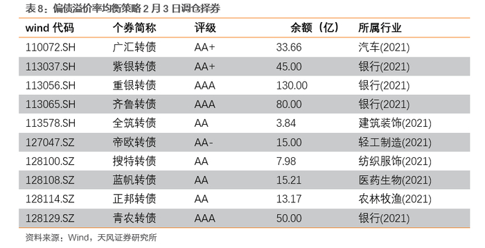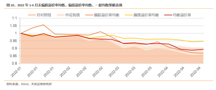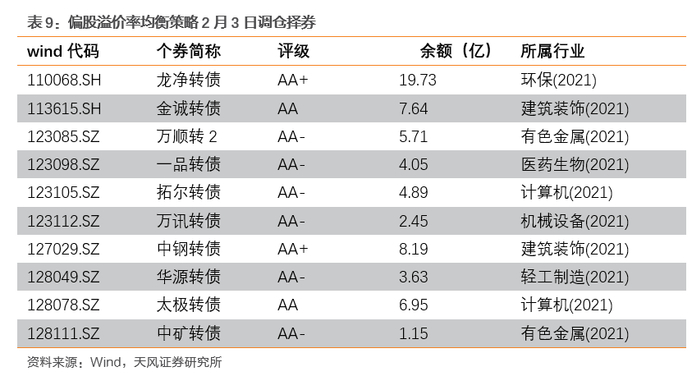 综上,如果股市前景向好预期明朗,且能承受一定回撤风险,偏股溢价率均衡策略是较好的选择,在股市下跌的过程中,可以选择偏债溢价率均衡策略进行防守;若市场预期不明确,或者正处于技术性调整的阶段时,我们认为可以选择一般溢价率均衡策略这种属性相对均衡的策略。