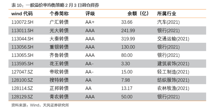 择券:每次调仓选择10只转债等权重投资。进行转债选择时剔除AA-以下评级、或调仓时规模已低于1.5亿、或前一交易日成交额低于1000万、或存在异常价格波动的转债。很多转债投资者不考虑AA-评级以下的转债。调仓当日规模、成交额过低的转债容易产生异常价格波动,我们也予以剔除。在调仓日执行策略进行投资时,异常价格波动转债的量化指标:①平价高于100元且转股溢价率高于45%②平价小于100且价格高于150元。