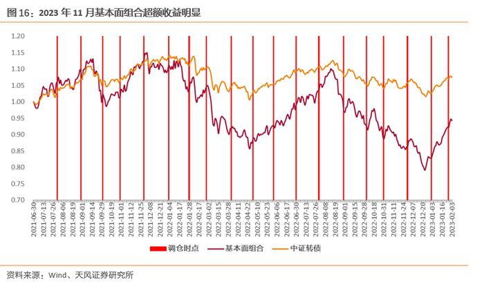 2023年1月天风转债基本面组合上涨11.33%,同期中证转债指数涨4.23%,基本面组合相对跑赢7.09个百分点,组合超额上涨的原因主要为:基本面组合构成多为弹性股,1月权益市场转好利好弹性品种;1月信创和电新表现较好,组合相关标的受益。