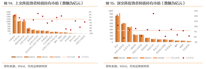 交易所披露2023年1月投资者转债持有结构。两市转债持有市值环比增长较多的投资者主要为基金、券商自营、企业年金等,总体来看主流机构增持意愿较强,可能由于1月权益市场预期进一步转好,机构投资者对后市信心强化。主要发生减持的为自然人投资者。