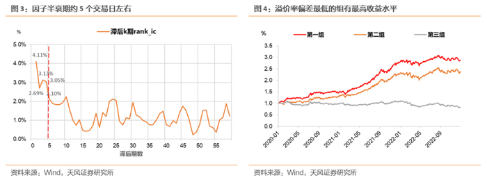 每只转债截面回归得到的残差即为实际溢价率与均衡溢价率的差值,记作溢价率偏差。以溢价率偏差为基础构建因子:IC值方面,日度因子Rank IC 4.11%,半衰期大概一周(5个交易日);从排序法的角度看,每个交易日按截面回归残差将所有转债分成三组,不考虑交易费率的情况下等权重投资,各组平均收益率具有明显的单调性,溢价率偏差最低的组具有最好的收益水平,反之收益水平最低。这些数据说明实际溢价率– 均衡溢价率是一个好的预测变量。