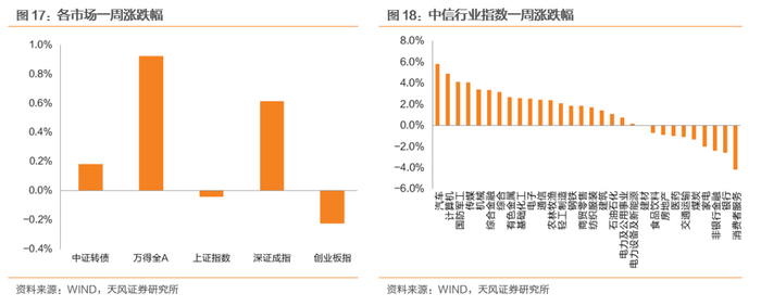 截至周五收盘,上证指数收于3263.41点,一周下跌0.04%;中证转债收于410.87点,一周上涨0.18%。从股市行业表现情况看,汽车(5.8%)、计算机(4.9%)、国防军工(4.1%)涨幅位居全行业前三;跌幅前三为消费者服务(-4.2%)、银行(-2.6%)、非银行金融(-2.4%)。