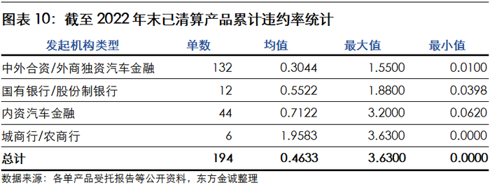 截至2022年末,按照不同发起机构,对已清算产品累计违约率均值进行统计可知,中外合资/外商独资汽车金融(0.3044%)<国有银行/股份制银行(0.5522%)<内资汽车金融(0.7122%)<城商行/农商行(1.9583%)。外商独资/中外合资汽车金融公司占据国内中高端车型市场,对应车贷借款人经济实力较强,具备更强的偿债能力;同时其车贷业务开展较早,风控体系较成熟,风控能力相对较好,而内资汽车金融公司由于业务起步较晚,风控体系也相对较弱。相较于国有银行/股份制银行,城商行/农商行主要系中低端车型,借款人偿债能力更弱,且整体风控能力较弱。