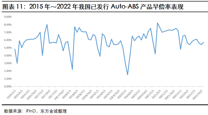 Auto-ABS产品基础资产池年化提前还款率(CPR)普遍位于5%~10%之间,整体早偿率处于较低水平;且因证券偿付以过手摊还为主,流动性风险较小