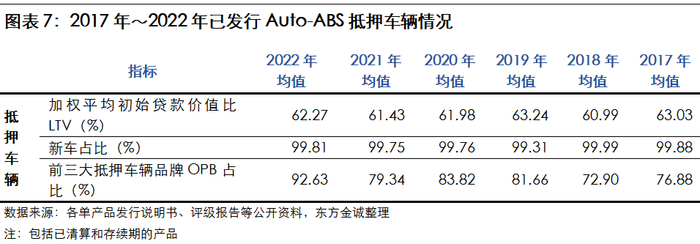 Auto-ABS产品基础资产绝大部分由借款人以汽车提供抵押担保,且抵押车辆以新车为主,加权平均初始贷款价值比(LTV)在60.00%~64.00%之间,抵押担保较充分,对产品到期兑付形成有利支撑;抵押车辆新车占比在99.00%以上。