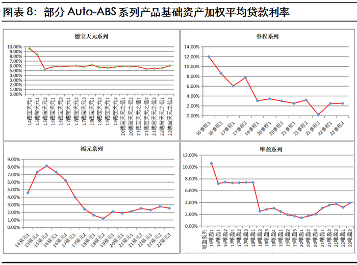 本报告选取了发行期数较多的“德宝天元”系列、“睿程”系列、“福元”系列和“唯盈”系列的产品,对其基础资产加权平均贷款利率进行统计。从以上产品可以看出,入池资产的加权平均贷款利率呈整体下降趋势。