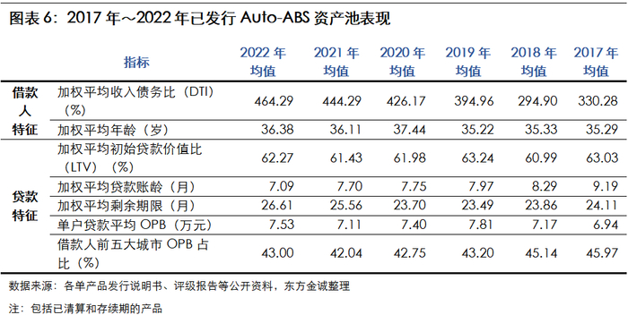 借款人的还款能力是影响基础资产违约率的重要因素,借款人的年龄、收入债务比(DTI)是判断借款人还款能力的重要指标。从各年已发行Auto-ABS来看,借款人年龄均值处在35岁左右,该年龄段借款人多处于收入稳定期,有助于其按时足额偿还贷款;Auto-ABS借款人加权平均收入债务比(DTI)均值自2018年起逐年上升,2022年均值为464.29%,较上年末进一步提升,还款能力有所提升。