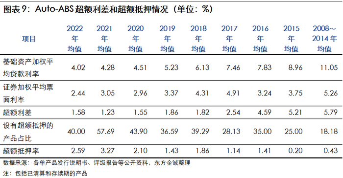 2015年~2022年,已发行的Auto-ABS产品基础资产加权平均贷款利率从8.96%下降至4.02%,呈现明显的逐年持续下降趋势。随着汽车金融公司及汽车融资租赁业务的竞争加剧,汽车主机厂商为了促进汽车的销售,可能加大与汽车金融公司的合作,进一步增大贴息贷款力度。预期未来,Auto-ABS产品基础资产的平均利率水平仍将有一定程度的下降,产品的超额利差将有所下降,对产品的保护程度将有所下降。