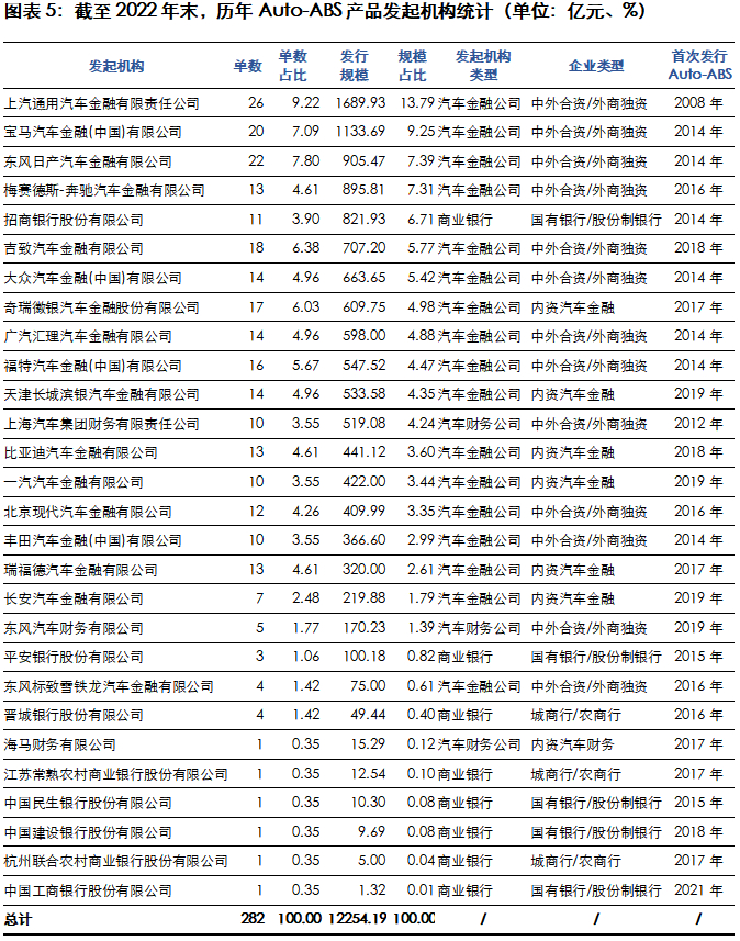 截至2022年末,市场共获批成立25家汽车金融公司,其中17家汽车金融公司已发行Auto-ABS,剩余8家汽车金融公司还未发行Auto-ABS,包括菲亚特克莱斯勒汽车金融有限责任公司、沃尔沃汽车金融(中国)有限公司、三一汽车金融有限公司、华泰汽车金融有限公司、华晨东亚汽车金融有限责任公司、上海东正汽车金融有限责任公司、山东豪沃汽车金融有限公司和裕隆汽车金融(中国)有限公司。