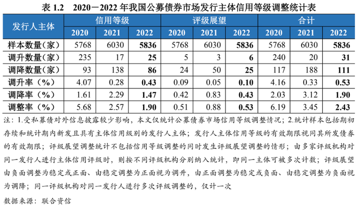 2022年,公募债券市场上共有111家发行主体信用等级发生调整,调整率为1.90%,较2021年(2.57%)和2020年(5.68%)进一步下降,评级稳定性有所提升。