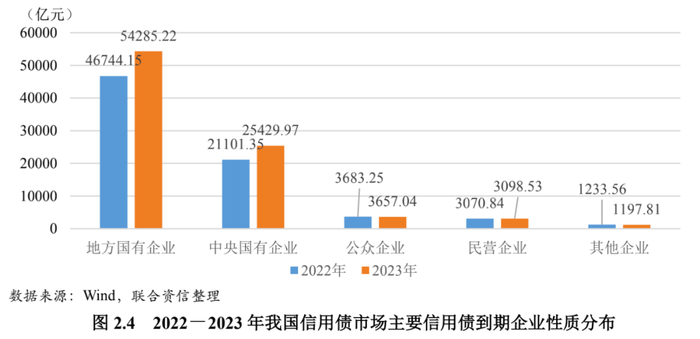 从企业性质看,2023年地方国有企业债务到期规模约为5.43万亿元,较上年(4.67万亿元)有所上升;中央国有企业债务到期规模约为2.54万亿元,较上年(2.11万亿元)有所上升;公众企业债务到期规模约为0.37万亿元,民营企业债务到期规模约为0.31亿元,其他类型企业债务到期规模约为0.12万亿元,均与上年同期基本持平。