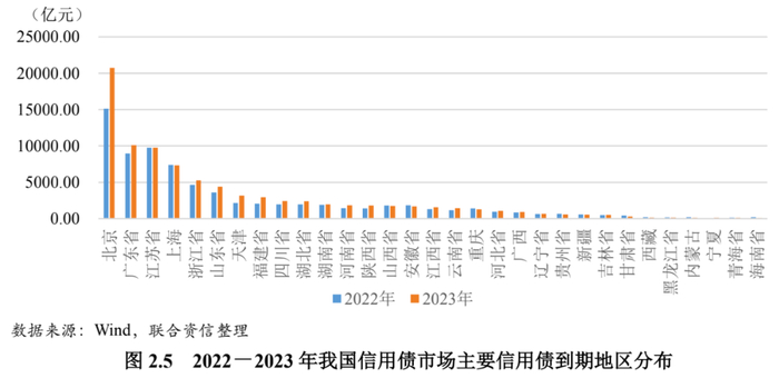 从地区分布看,2023年,北京、广东、江苏、上海和山东省的债券到期规模排名靠前,区域偿债压力相对较大;与上年相比,2023年北京(37%)、天津(48%)、福建(43%)、河南(30%)和陕西(30%)的债券到期规模大幅增长。