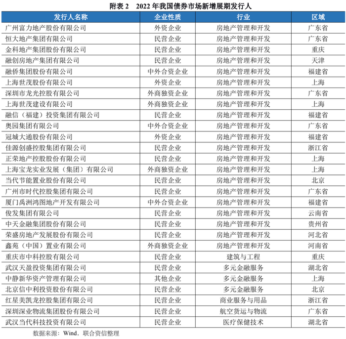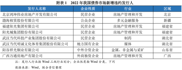 此外,2022年新增违约主体中有1家公众企业渤海租赁股份有限公司以及2家外资企业阳谷祥光铜业有限公司和广西万通房地产有限公司。