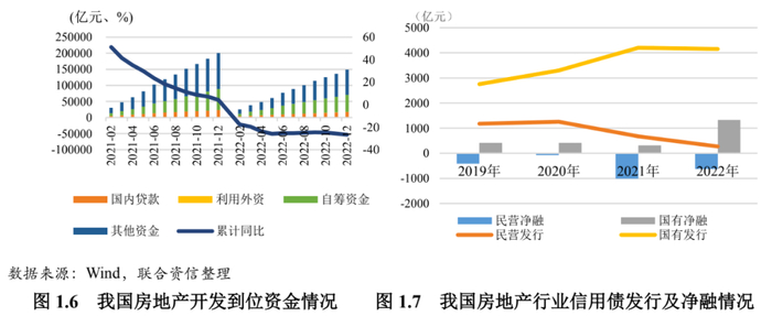 2022年房地产行业延续了去年的低迷态势,在销售端和融资端双向承压的同时,“停工断贷潮”进一步打压市场信心,行业基本面下行与房企信用弱化形成负反馈效应,行业信用风险加速释放。一方面,受国内疫情反复、经济下行压力加大及停工断贷风波等多重因素影响,房地产市场预期转弱,需求端萎靡,融资受阻,房企到位资金压力较大。2022年,房地产开发企业到位资金累计13.33万亿元,同比下降26.70%。另一方面,尽管今年以来房地产行业融资端政策持续发力,但受大中型房企违约事件频发影响,投资者偏好下行,房企融资表现出两极分化,资金更多地向优质房企归集。国有房企的债券净融同比大幅提升320.26%,而民营房企净融依然为负,但净流出规模有所收缩。