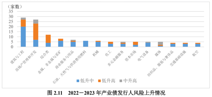 产业债发行人中,建筑与工程、房地产管理和开发、综合类、金属、非金属与采矿和商业服务与用品行业风险档次上升的企业家数最多,其中房地产管理和开发行业风险档次由低升高和中升高的企业家数最多,共20家,其次为建筑与工程行业,由低升高和中升高的企业共9家。