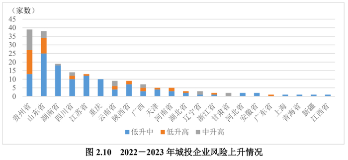 城投企业中,贵州省、山东省、湖南省、四川省、江苏省、重庆、云南省和陕西省风险档次上升的企业家数最多,其中贵州省风险档次由低升高和中升高的城投企业家数最多,共26家,其次为山东省,由低升高和中升高的城投企业共13家。