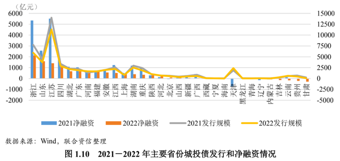 2022年,城投债整体仍然延续严控新增隐性债务的基调,融资环境整体偏紧,城投债的发行规模和净融资规模均有所收缩。具体来看,2022年城投债总发行规模为4.86万亿元,同比下滑13.30%;同时,受前几年城投债市场的迅速发展影响,城投兑付压力持续加大,2022年总偿还量达3.75万亿元,同比上升14.93%;在发行收缩、偿还量上升的背景下,净融资规模出现明显下滑,净融资额为1.11万亿元,同比大幅下滑52.57%。区域方面来看,城投债融资区域分化显著,经济相对发达、财政实力较强的区域仍为融资主力,2022年浙江、山东和江苏地区的净融资规模位居前三,占全城投市场净融资规模的46.21%,但净融资规模呈明显收缩态势;河南、河北、山西、天津等地城投债净融明显改善,其中天津净融资由上年的大规模净流出转为净流入;而贵州、甘肃等地的融资难度较大,净融资缺口持续扩大。信用等级方面,城投债发行主体仍以高等级主体为主,AA+级及以上发行人城投债发行规模占比由72.95%攀升至74.86%。