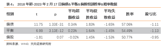 每个交易日各个组别转债平均相对正股的超额收益率记为当日该组转债相对正股的超额收益率。2018年以来,偏债、平衡组别转债明显跑赢正股,偏股转债平均超额收益率为负,但不显著。偏债组别相对正股平均超额收益率、胜率均为最高。平衡组别盈亏比相对其他两组更高,其平均获胜差额也更高。偏债转债相对正股投资优势更明显,但平衡型转债赔率更好。