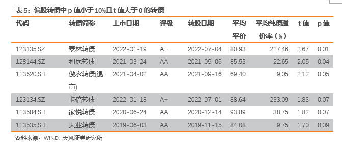 是否有长期能够跑赢正股的偏股转债?很少。即使我们将显著性的要求放宽到10%左右,筛选出来的能跑赢正股的要么是或受到炒作的个券,如前所述的卡倍转债、泰林转债等;要么是虽然平价较高,但是债底保护较厚,导致纯债溢价率过低的“伪偏股”转债,如傲农转债等。这证明了在偏股转债的投资过程中择时的重要性:若不进行择时投资而是长期持有,偏股转债表现不会长期好于正股。