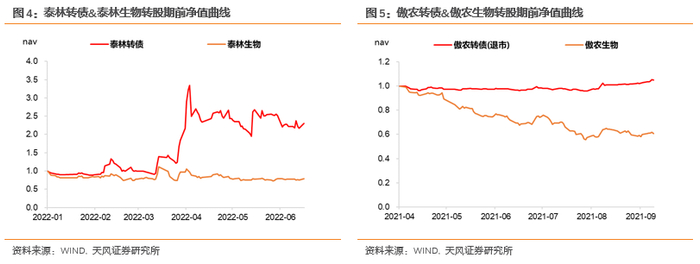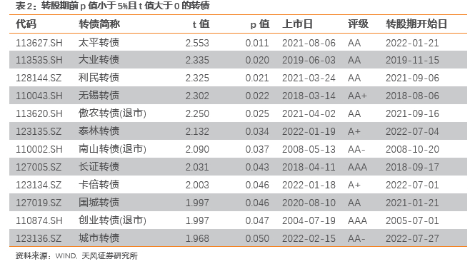 是否有在转股期前始终能跑赢正股的转债?转股期前,转债相对正股日超额收益显著为正的转债如下所示:整体来看,这几只转债存在以下两种情况(1)转债债底较厚支撑起整体价值,正股表现不佳,转债跟跌但幅度显著更小,如太平转债、傲农转债等。(2)发行量偏小,或曾经受到过炒作,如泰林转债、卡倍转债。