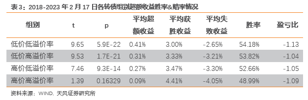 将未来5个交易日期间的平均转债日收益率-正股日收益率记为该组别当日的超额收益率。从每组转债5个交易日相对股票累计超额收益情况来看:所有组别均有显著为正的周超额收益。其中,高价高溢价率组别相对正股超额收益最高,其次是低价高溢价率,高价低溢价率。低价低溢价率组超额收益最小。溢价率越高,价格越高,所在组别的超额收益越高;胜率方面,低价组别胜率更高;盈亏比方面,高价组别盈亏比更高。