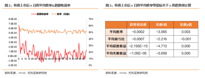 下表是上述指标的计算结果:上市后n日转债平均超额收益显著为正,胜率显著高于50%。这表明整体上看,上市后的100个交易日内,转债每日跑赢正股的概率较大。转债相对正股的优势明显存在随着时间衰减的特征:上市后n日转债平均胜率关于n趋势项系数显著为负,这说明随着n增大(距离转债转股期更近),转债每个交易日跑赢正股的概率越低。从赔率角度看,上市后n日转债平均获胜收益、上市后n日转债平均失败收益、盈亏比均同样存在负的趋势项。这说明随着转债临近转股期,转债的超额收益率赔率下降,转债收益率表现越来越趋近正股。