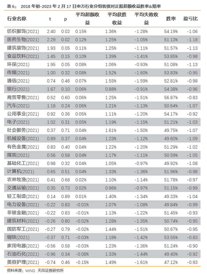 分别计算不同申万行业转债相对正股的超额收益:2018年以来的A级及以上转债中,纺织服饰、医药生物两个行业的转债能够较其正股获得显著超额收益。而电力设备、非银、国防军工、钢铁、家用电器、石油石化等多个行业其转债相对正股有负超额收益,但不显著。