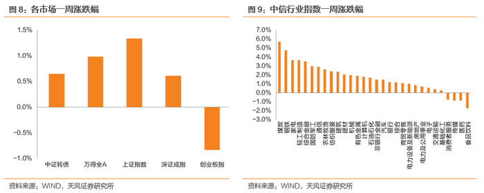 截至上周五收盘,上证指数收于3267.16点,一周上涨1.34%;中证转债收于405.55点,一周上涨0.65%。从股市行业表现情况看,煤炭(5.7%)、钢铁(4.8%)、家电(3.6%)涨幅位居全行业前三;跌幅前三为食品饮料(-1.7%)、医药(-0.9%)、传媒(-0.9%)。