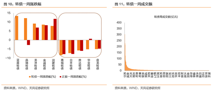 本周无转债上市。两市合计318只转债上涨,占比67%,涨跌幅居前五的为蓝盾转债(13.35%)、晶瑞转债(12.13%)、龙净转债(9.14%)、金诚转债(8.56%)、润建转债(7.81%),涨跌幅居后五的为惠城转债(-8.39%)、日丰转债(-7.23%)、胜达转债(-5.76%)、华亚转债(-5.13%)、盘龙转债(-5.03%);从相对估值的角度来看,189只转债转股溢价率抬升,占比40%,估值变动居前五的为蓝盾转债(33.81%)、晶瑞转债(23.37%)、起步转债(20.60%)、科利转债(12.51%)、恒锋转债(12.22%),估值变动居后五的为弘亚转债(-29.64%)、荣泰转债(-26.20%)、多伦转债(-25.36%)、华体转债(-20.95%)、沪工转债(-20.44%)。