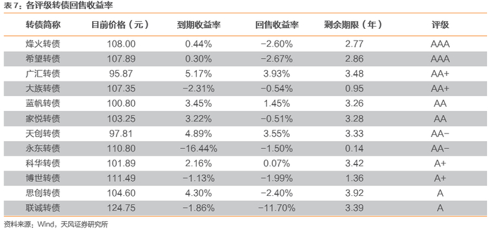 本周各评级可转债按回售收益率排行的情况如下: