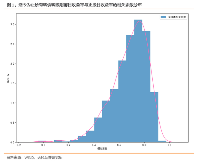 与正股相关性强的转债,其收益率仍有很大部分正股涨跌解释不了;很少有转债与正股相关性弱或不相关:通过计算市场上所有转债转股期前转债和正股日度收益率的相关系数我们发现,绝大多数转债相关系数落在0.6-0.8之间,中位数0.70,并且分布呈现一定的肥尾特性,很少有转债落在-0.2-0.2的区间内。