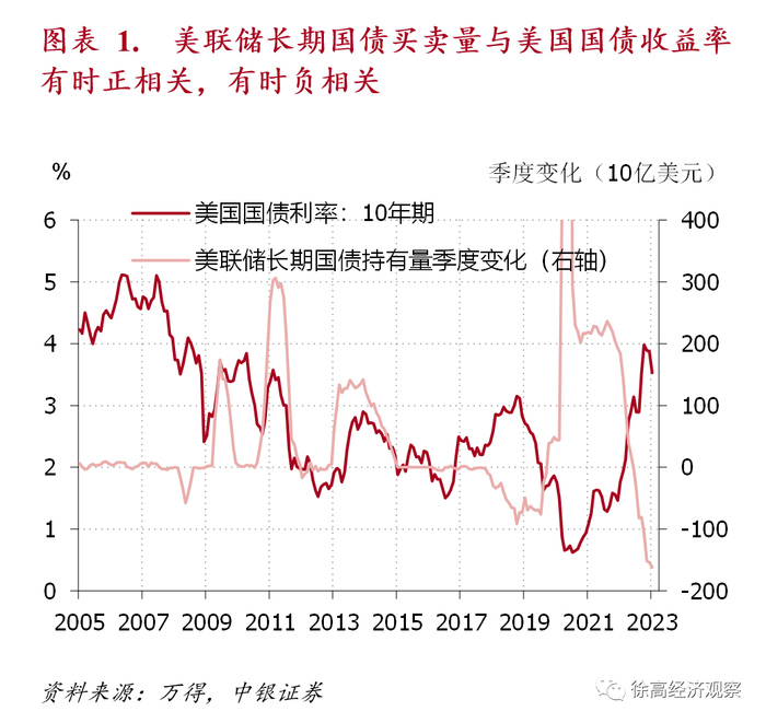 有人可能会觉得,美联储作为当前市场上最大的美国国债交易者,应该是它买国债,国债收益率就跌(国债价格涨);他卖国债,国债收益率就涨(国债价格跌)【3】。从2018年到现在,美联储每季度买卖美国长期国债的数量,与美国10年期国债收益率确实是负相关关系。但如果观察发生在2009年、2011年和2013年的那3次量化宽松(QE1、QE2和QE3),美联储的美国长期国债购入量,与美国国债收益率反倒是正相关的——美联储买国债的时候,国债收益率不降反升。所以,美联储的购债规模与美国国债收益率之间,有时负相关、有时正相关。(图表 1)