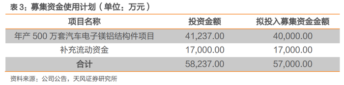 本次公开发行可转债拟募集资金额为不超过5.7亿元,其中4亿元拟投入年产500 万套汽车电子镁铝结构件项目,剩余1.7亿元拟用于补充流动资金。