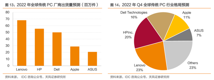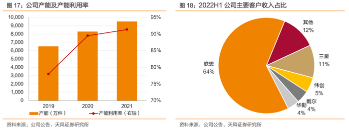 消费电子结构件行业集中度有望提升,下游联想龙头地位稳固。据IDC咨询公众号,全球传统PC行业前五大厂商2022Q4市占率为77.1%,同比增长1pct;联想2022年出货量预计为0.68亿件,市场占有率或将达23.3%,PC龙头地位稳固。下游行业集中度的提高,使品牌商在选择上游供应商时更加注重规模、管理和技术能力,大型笔记本结构件生产企业将获得更多机会,行业集中度有望提高。同时,2022H1,联想是春秋电子的第一大客户,收入占比达63.72%,公司有望受益。